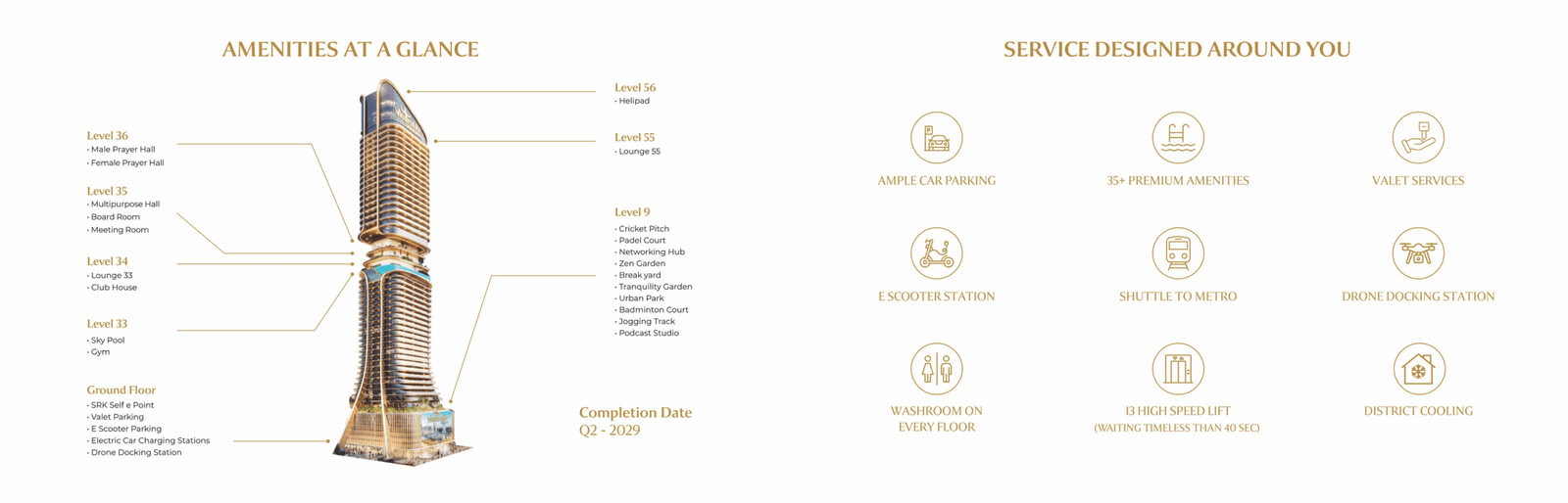 Designed with a deep understanding of modern business needs, Shahrukhz brings together premium commercial units, ultra-modern amenities, luxury wellness elements, and an iconic design language that stands out on the Dubai skyline. It is more than a commercial tower — it is a destination where global aspirations meet practical advantages, where brands grow, and where companies script their next chapter of excellence.